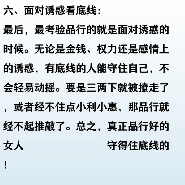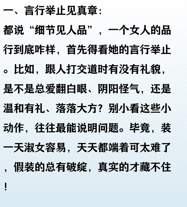 女人的品行如水,细节中自见端倪。 用心观察她的言行举止,便能窥见内心的温度。真正的好品行,往往藏在日常点滴中,经得起时间的考验。